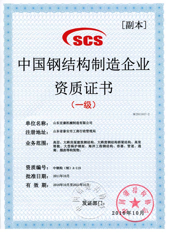 中國鋼結構制造企業資質證書